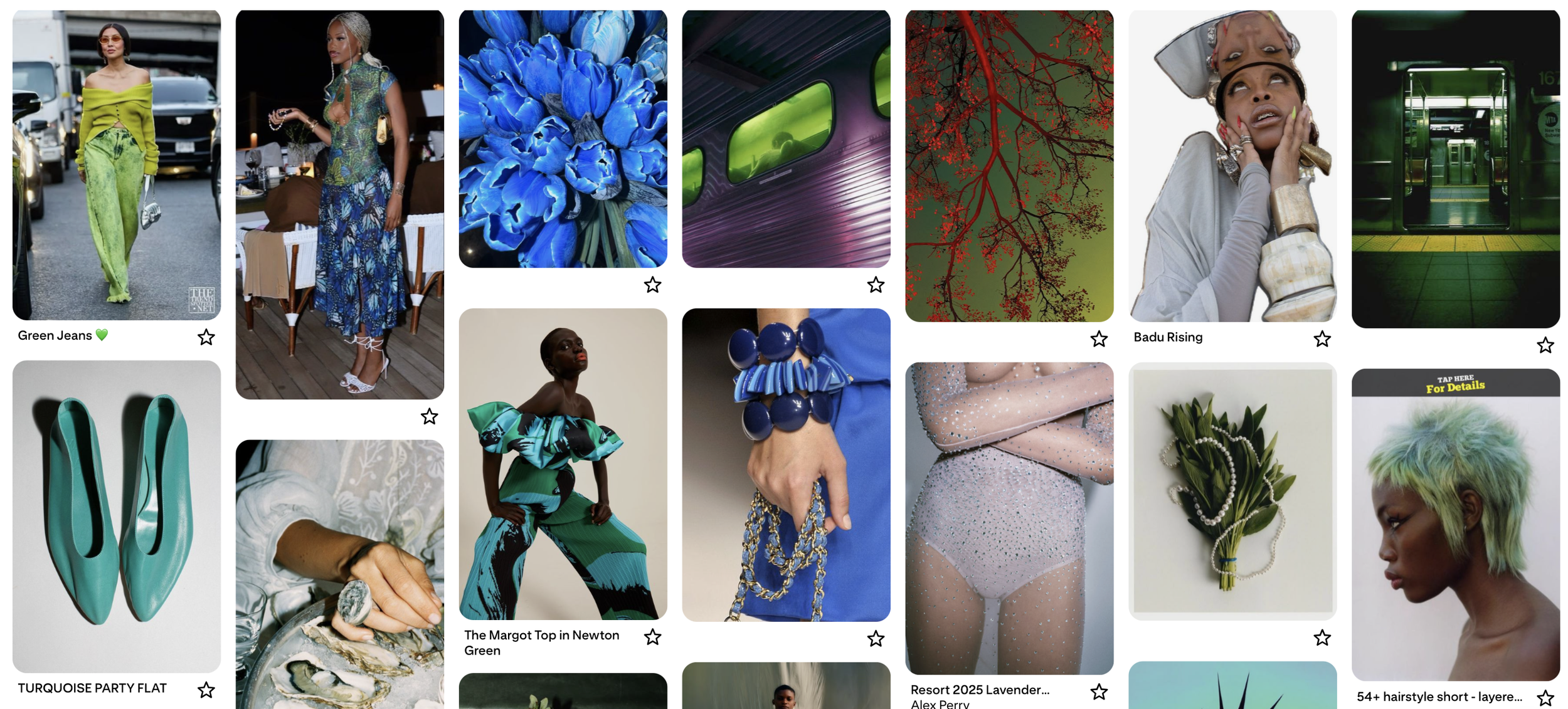 This moodboard conjures bodies as artifacts: lips painted cobalt, nails heavy with clusters of jewels, skin punctuated by shimmer or grit. Textiles mirror geological formations, pleated like ridges, sheer like water, metallic like ore. Forms are stretched between organic and synthetic, snakes curling against hands, flowers pressed into neon circuitry, pearls reimagined as pods and pools.